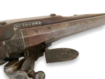 This pistol by the famous gunmaker Robert Wogdon has a long 10.9" octagonal swamped barrel with his typical early form of wide tapering short butt. The rebrowned 28 bore barrel is signed on the top flat ‘Wogdon LONDON’ with silver front sight and fixed rear sight, London proofs. Tang pattern with foliate engraving of c.1778-80 pattern. Roundel engraved reinforcing plate opposite gold touch hole. Stepped bevel edged lockplate with sliding safety and typical Wogdon Swan neck flintcock and frizzen. Lock signature of c.1775 pattern. Walnut full stock with slab sided butt. Ramrod with exposed steel worm. Engraved steel mounts including triggerguard with acorn finial, ramrod pipes and buttcap. Vacant silver escutcheon. Overall length 16.5". A rare but original variation of a Wogdon pistol.