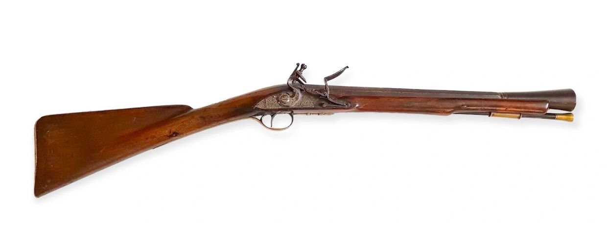 A rare iron barrel brass mounted blunderbuss circa 1775 by Francis Innes of Edinburgh. Octagonal 16 1/2in. iron barrel with flared round trumpet muzzle banded at the intersection, some pitting to top flat. Makers address to top flat of barrel - indistinct due to pitting but clearly name or address followed by EDINBURGH with proof marks and barrel makers stamp to breech. Flat lockplate with stepped pointed tail signed within banner 'F. INNES', plain frizzen, swan neck cock, some pitting but all original. Walnut handrail full-stock with exposed muzzle, some old well executed spliced/inset repairs to stock. Brass furniture including rococo escutcheon to wrist, pierced sideplate shaped with flowers (complete with no losses), acorn finial, flower engraved trigger guard, ramrod pipe and interesting buttplate with bird engraving (wings displayed) above top screw, brass tipped ebony ramrod. Bird engraving to buttplate may be decorative or with further research may reveal owner if unique.
