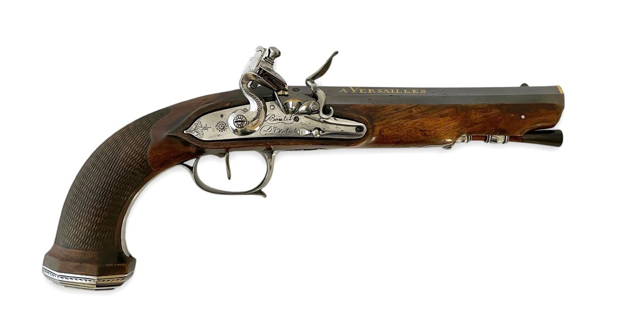 An excellent and rare 24 bore flintlock Officers pistol by Boutet circa 1810. 7.25" blued octagonal barrel inlaid in gold MANUFACTURE A VERSAILLES with inlaid engraved gold arrow (2.15" long) to top flat together with gold arrowhead either side of front blade sight, twin gold lines to breech with dog tooth engraving and similar single gold line to muzzle. Gold filled barrel makers poincon stamps (some gold loss) to top three flats at breech of "LC" for barrel-maker Jean Nicolas Le Clerc (Neue Støckel 3741), gold oval touch hole, Inspectors mark of a Crown over M on left vertical flat towards breech. Blued border engraved tang with engraved screwhead and fixed rear sight.