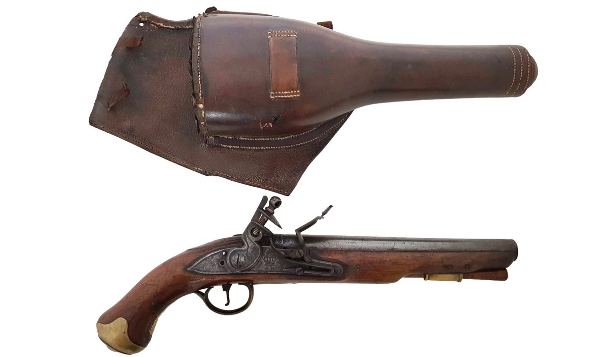 An early dated 1786 Regulation Light Dragoon Flintlock Pistol. 15½" overall, 16 bore 9" round barrel with regulation proof marks, border engraved flat lockplate signed Crown over GR, border engraved cock, regulation furniture including lobed butt cap, brass trigger guard, side plate and ramrod pipe. Original ramrod. Stock with marking of Crown over entwined GR and 1786. Also stock makers mark of BW to side plate and an inspectors crown mark near trigger guard. Pan is slightly pitted otherwise very good original metalwork. Excellent lock. Stock has normal handling marks but all original. Period holster in very good unrestored worn condition.