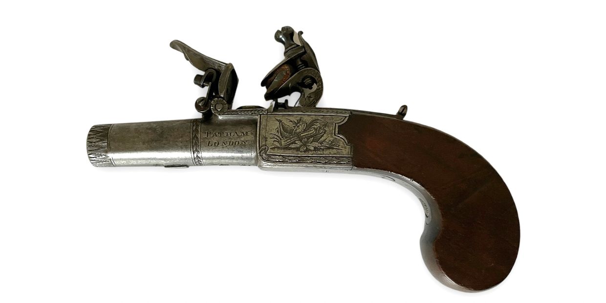 A CRISP GEORGIAN FLINTLOCK 54 BORE POCKET PISTOL BY TATHAM OF LONDON