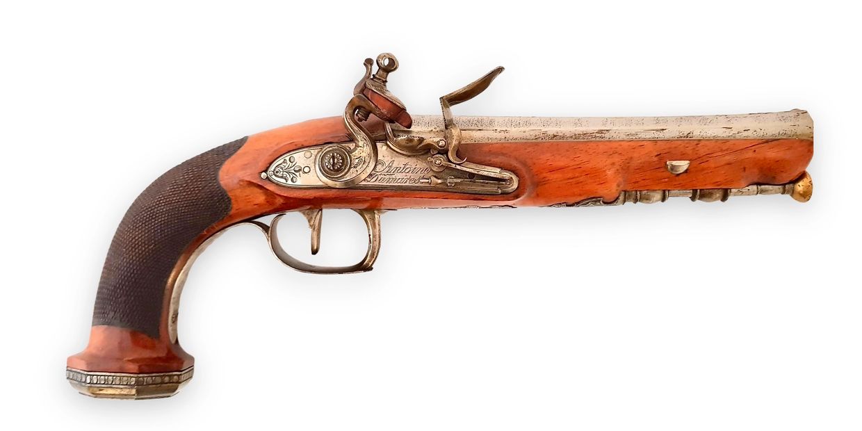 An excellent French Flintlock Officers or Holster Pistol, signed 'Antoine Dumarest’, circa 1790. With .69 large bore (same as Charleville musket) 7.25" multi groove rifled Damascus hexagonal swamped barrel with bead foresight and notched rear sight. Barrel is cleaned bright but shows remains of original Damascus finish, superbly executed rifling is very strong and bright indicating little use. Flat lockplate is finely engraved and signed Antione Dumarest with all original lock - flintcock shoulder has been repaired at some stage, border engraved roller frizzen, strong action. All iron mounts consisting of finely engraved tang, buttplate, trigger guard, ramrod pipes, barrel wedge and sideplates. Light Walnut stock in excellent condition showing signs of old refinish with crisp original chequering, vacant silver escutcheon to rear of sideplate. Overall length 13.5".