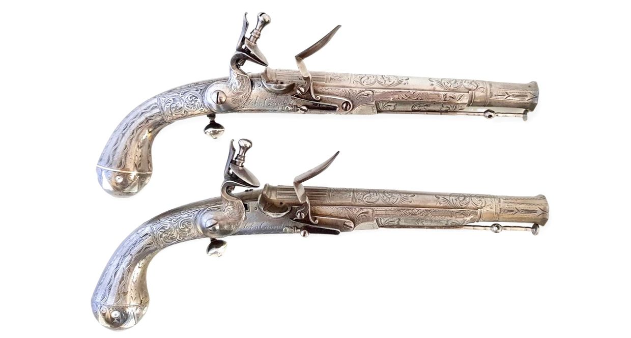 An elegant and highly desirable pair of Scottish Doune Flintlock pistols with four stage 25 bore barrels with fluted breech section, round centre sections with superbly executed and profusely engraved foliage, octagonal engraved muzzle section with flared muzzles. Original ramrods. Locks of typical form with a sear extending through the lock plate which holds the cock in the half cock position, deep scroll engraving to rear of lockplates, wavy line edges, swan neck cocks with matching engraving, sprung frizzen with shaped finial to frizzen spring. Typical John Campbell signature engraved in script on the lockplate. Stock profusely engraved with a combination of scrolls, parallel lines and waves, acanthus leaves and chevrons with three transverse bands of engraved silver inlay under the stock. Hollow ball trigger with engraved silver petals overlay. Belt hook with typical Celtic pierced double lyre shape which can also be seen on best basket hilted swords of the period.