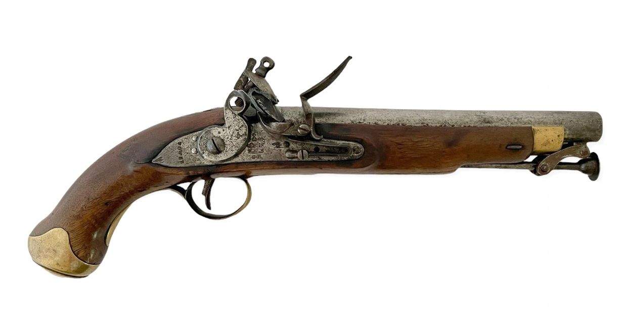 A very good all original New Land Pattern Regulation Issue Flintlock Pistol. 16 bore, 9" barrel with crisp Ordnance View and Proof Marks, number 44 under indistinct mark behind frizzen, barrel in excellent condition. Tang marked 2 to rear. Flat lockplate marked with a CROWN over GR, Ordnance Inspectors stamp of a Crown over arrow and TOWER to rear. Flat ring neck reinforced cock, raised pan with engraved bridle. Excellent working action. Walnut fullstock with various Ordnance and storekeepers marks with an Ordnance Crown over broad arrow and date of 1805 (feint) stamped behind rear of lockplate. Swivel ramrod. Regulation brass mounts.