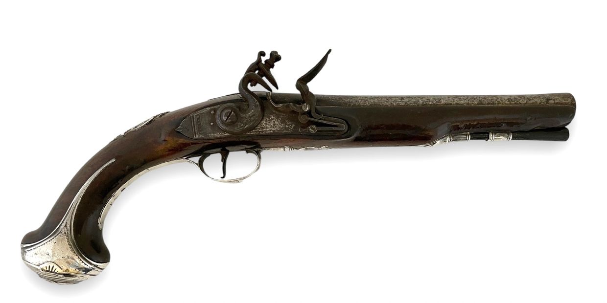 AN EARLY SILVER MOUNTED ENGLISH FLINTLOCK HOLSTER PISTOL SILVER HALLMARKS 1741-1742