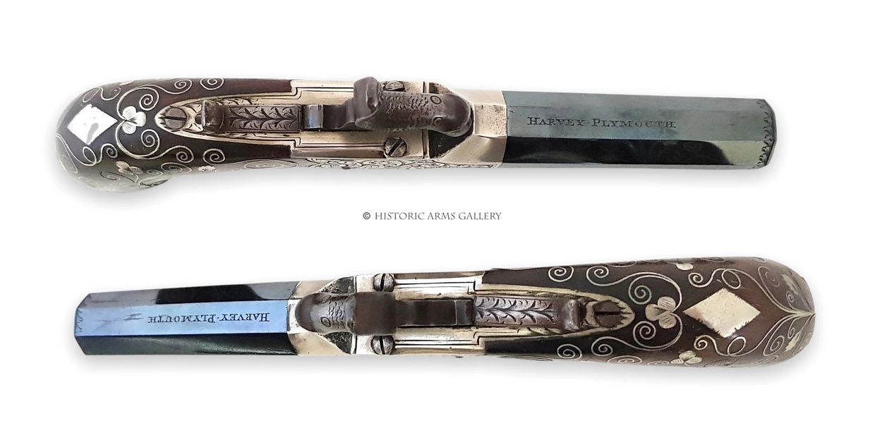 A very good quality pair of Silver Mounted Boxlock Percussion Travelling or Ladies Muff pistols by Harvey of Plymouth, circa 1830. Octagonal 2.5" turn off blued barrels engraved at muzzle with line engraving at breech, top flat signed HARVEY - PLYMOUTH, crisp post 1813 Birmingham Proofs with crisp edges - minor scratches. Solid Nickel Silver frames with scroll engraved actions merging with barrel engraving, sliding safeties, drop down triggers, crisp proof viewers marks. Strong working actions. Rounded butts are profusely engraved in silver wire with various flowers and vacant silver diamond shape escutcheon. No losses to silver wire inlay, excellent wood to silver frame fit with no shrinkage. Dolphin head engraved hammers. Overall length 6.75".