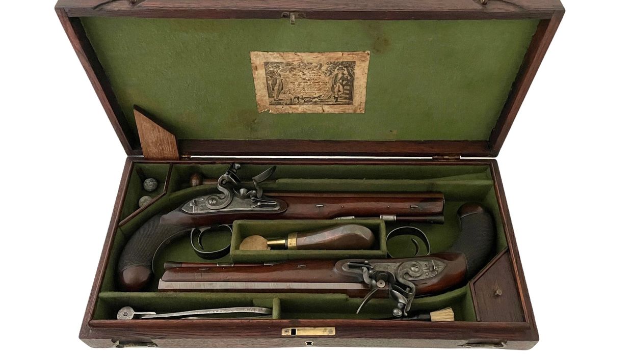A Good Cased Pair of 16 Bore Flintlock Duelling Pistols circa 1795 by W. Parker, Holborn, London. 9" rebrowned octagonal barrels signed LONDON on top flat, blade fore sight, platinum lined touch holes, starburst engraved tangs with notched rear sight. Flat bevelled border line engraved locks signed PARKER with starburst engraved to stepped tail. Sliding safety. Roller frizzens, semi rainproof pans, engraved swan neck cocks. Britannia shield and foliage engraved triggerguard, large pineapple finials. Engraved ramrod pipe. Figured full stocks with minor handling marks, crisp original chequering, vacant silver escutcheons, original ramrods, one with steel worm. Pistols 14.25" long in their original flame dark oak case with 1790-95 type flush fitting handle, inset brass hooks to front, with accessories including a few old 16 bore lead balls, patches, bevel edged copper and brass flask, pan brush, 16 bore bullet mould (pitted but good cavities). Original trade label to lid (some damage and staining).