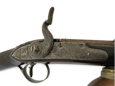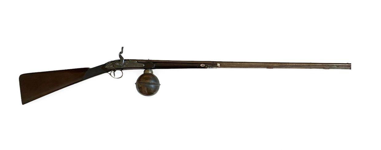 Figured Walnut half-stock carved in relief with a scallop shell behind the barrel tang (another indicator of early Egg style), butt with incorporated carved cheek-piece and chequered wrist, silver fore-end cap, silver barrel bolt escutcheons. Original iron ramrod. Border line engraved blued iron mounts also engraved with scrolls and foliage in very good condition. Complete with spherical copper reservoir with knurled medial band and threaded brass mount (probably the original). Mechanism not tested but mainspring is strong. Overall length 49 3/8".