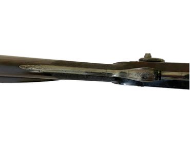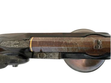 Air Guns of this period are normally associated with specialist makers such as Edward Bate so it is rare to find an example made by one of the greatest gunmakers of the period, Durs Egg. This superb piece of engineering has a smoothbore 33 3/4" two-stage sighted 40 bore barrel with silver blade fore sight and adjustable notched blued rear sight, octagonal breech with gold line - the top flat signed D EGG LONDON. Stepped bevelled edged lock signed D Egg in script (early style) with engraved cocking lever of flintlock style deliberately without the top jaw. Lockplate engraved with dog looking rearwards at two birds on the wing. Some minor pitting to lockplate and rebrowned barrel.