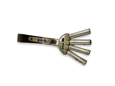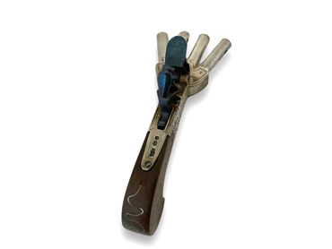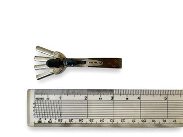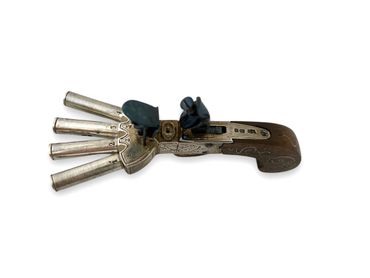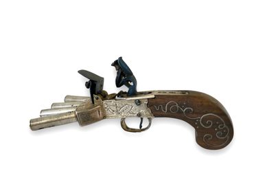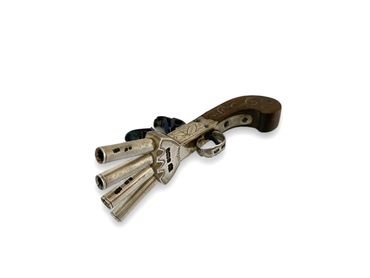 This superb miniature Duck’s Foot pistol was made by renowned English miniaturist Peter Dyson in 1990. A piece of Gentleman’s jewellery. It is only 3.2" long. There are four .75" long detachable barrels of hallmarked solid silver with engraved line to muzzles and barrels numbered 1, 2, 3 and 4 with corresponding numbers on the hallmarked silver frame which is border engraved with a stand of arms to each side, signed TWIGG on left side and LONDON on right side within a banner. Working boxlock action with engraved blued flintcock and border engraved sprung frizzen. Silver wire inlaid slab sided walnut stock. Hallmarks to triggerguard, top of action, each barrel and the main one under frame which has makers mark of PD for Peter Dyson, the Tudor rose denoting origin mark of Sheffield, a Lion Passant for the Silver Standard and the date letter of 1990. An exquisite miniature.