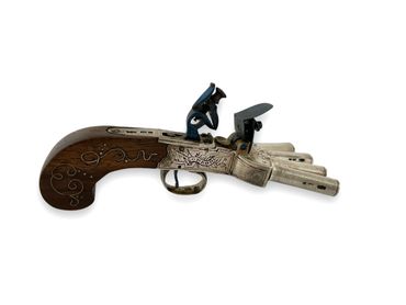 A FINE AND RARE HALLMARKED SILVER MINIATURE DUCK’S FOOT FLINTLOCK PISTOL SIGNED TWIGG
